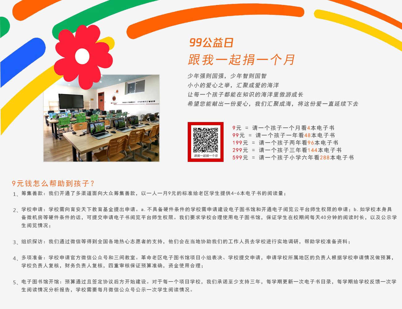 1、筹集善款:我们开通了多渠道面向大众筹集善款,以一人一月9元的标准给老区学生提供4-6本电子书的阅读量;